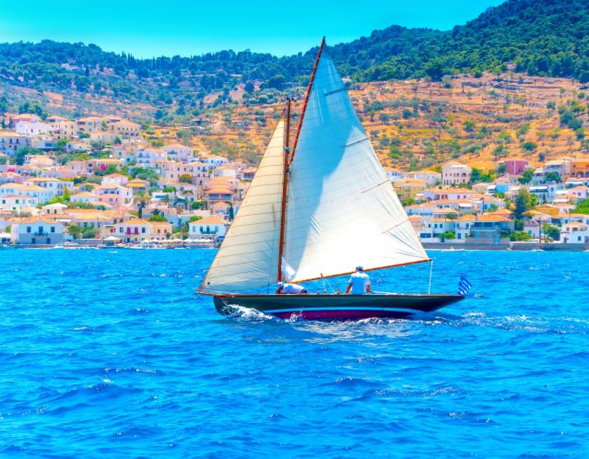 Spetses is almost at the entrance of Argolikos Gulf, in a short distance from the Peloponnesean shores (Porto Heli, Costa), while in the east there is the island of Hydra. Spetses has the shape of an egg with max.length 4 square km and width 2.5. The island is mainly pine, although due to fires less than in the past, and a vast part is being cultivated. The highest peak of the island is Prophet Elias, with 245m height.